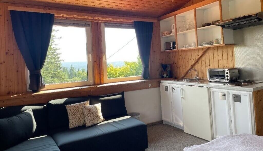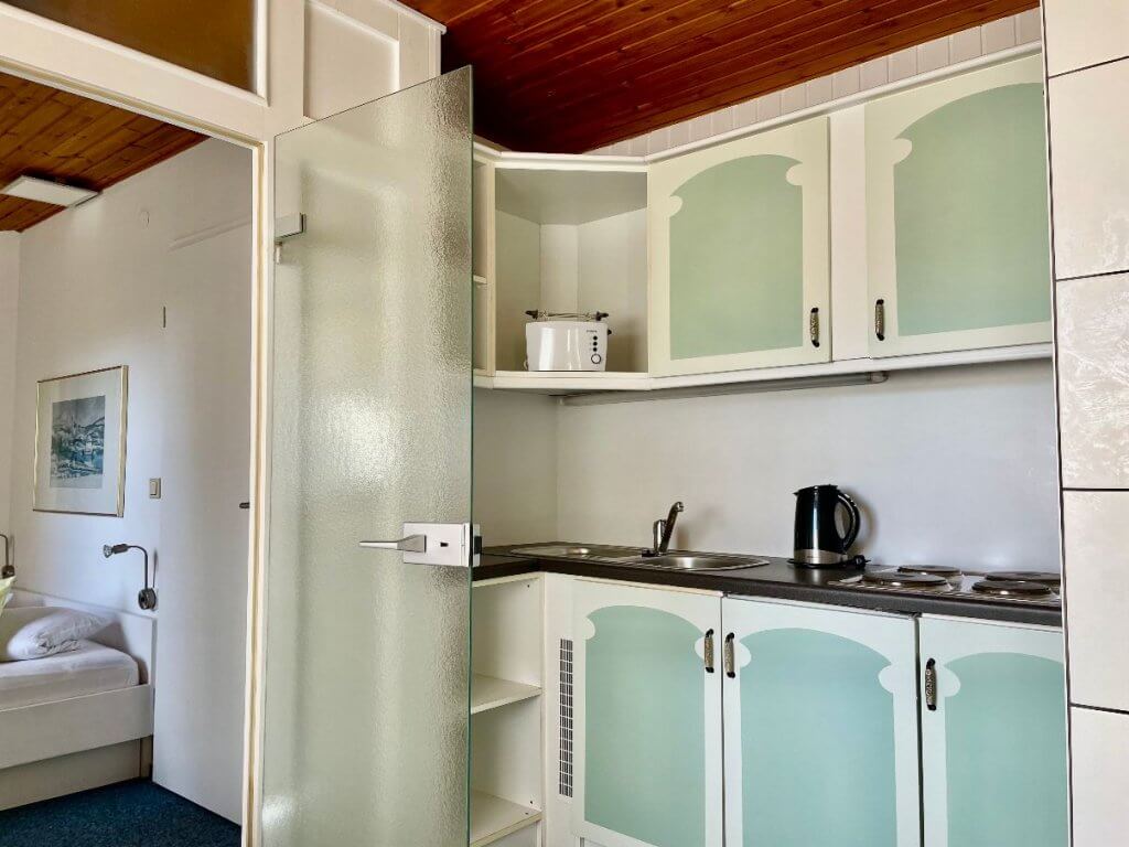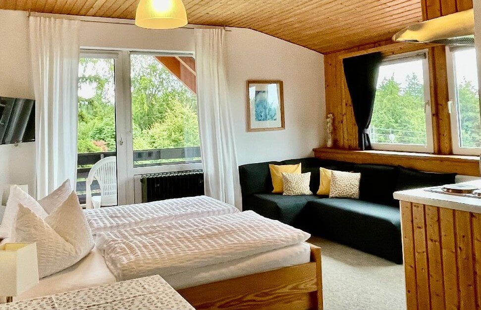 Wohnraum mit Küchenzeile, kl. sep. Schlafraum, West-Balkon (Sonnenschirm), TV, 2. Stock